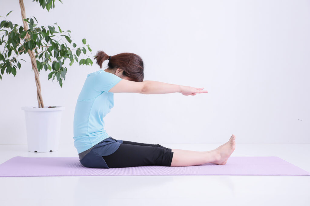 脚を大きく開いた状態で座り、背筋を伸ばしたまま体を前に倒します。内ももが伸びる感覚を意識しながらゆっくり行いましょう。